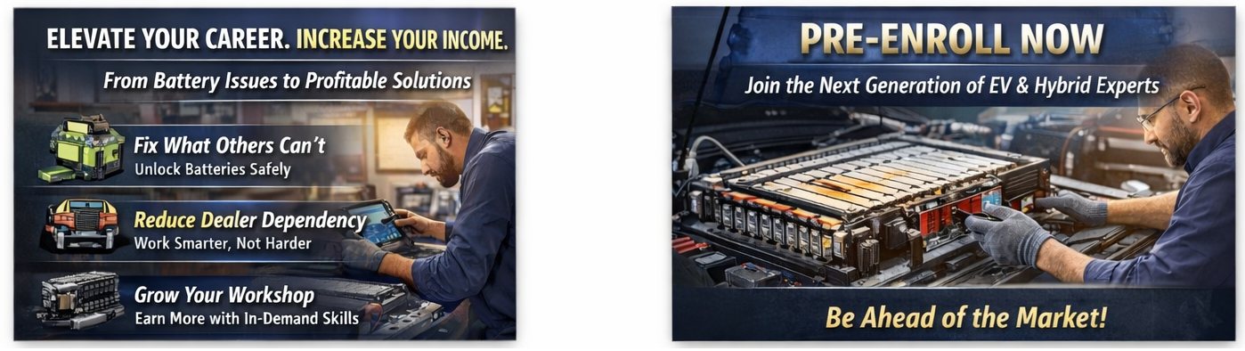 Pre-enrollment gives you early access, discounted pricing, and priority technical support. It also allows you to influence which vehicles and battery systems are covered first, ensuring the course matches real workshop demand.
